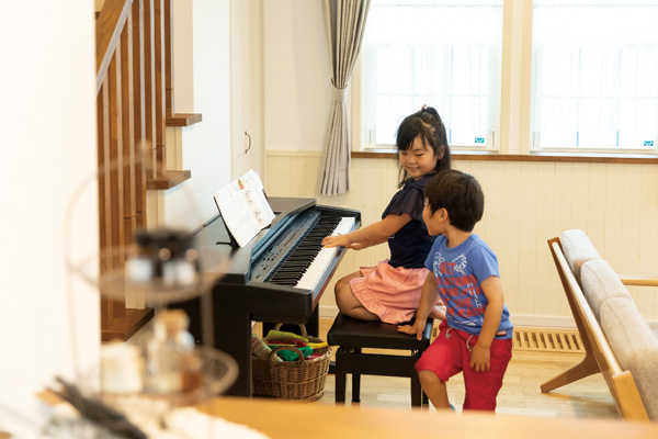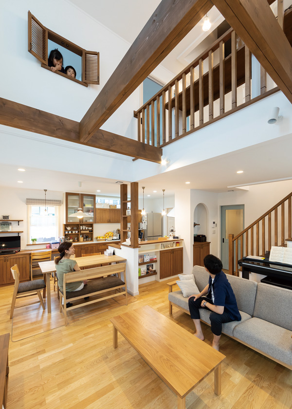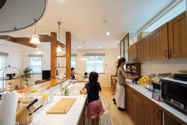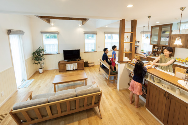 土地選びからサポートしていただき、いよいよマイホームのプランニングを開始。2階で遊ぶ子どもたちの声が聞こえる吹抜けをはじめ、温かみのある無垢フロア、キャンプ用品等の季節物を収納できるロフトなど、いろいろな希望を叶えていただきました。なかでもパンやスイーツづくりに必要なキッチングッズがすっきり収まるオリジナル収納は、とても重宝しています。主人は、2×4工法や冬暖かくて夏涼しい外断熱、快適に過ごせる換気システムなど、性能や仕様についても安心だったようです。居心地のいい住まいで過ごす家族の時間は格別です。